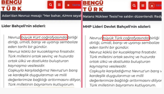 MHP Genel Başkanı Devlet Bahçeli’nin mesajındaki “büyük Türk coğrafyası” ifadesi, sitenin haberinde “büyük Kürt coğrafyası” olarak yer aldı. Kısa sürede sosyal medyada geniş yankı uyandıran hata kullanıcılardan yoğun tepki aldı.