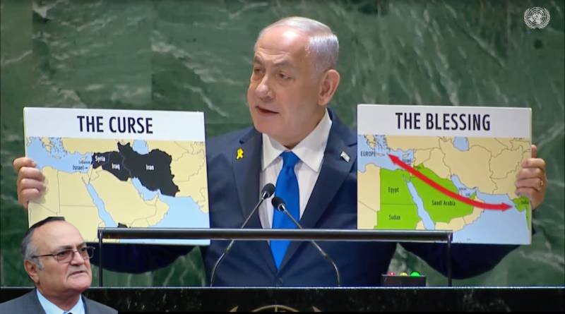 Manşet fotoğrafı: İsrail Başbakanı Binyamin Netanyahu, geçen yıl BM’de yaptığı konuşmada iki harita göstererek, Orta Doğu’daki çatışmaların bir nimet (The curse) ya da bir lanet (The blessing) arasında seçim olduğunu söylemişti.