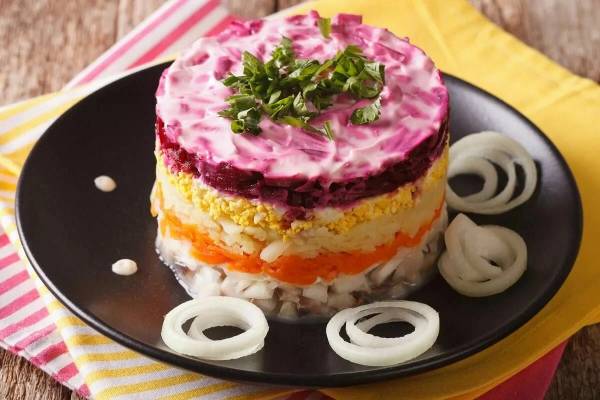 Selyodka pod şuboy (Kürk mantolu ringa/Şuba): Ringa balığı, pancar, patates, yumurta ve havuç katmanlarından oluşan meşhur salata. Katmanlar bir kürk manto gibi balığı sardığı için bu ilginç adı taşıdığı düşünülüyor. (Aşağıdaki fotoğraf)