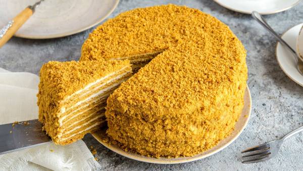 Medovik (Balkekli pasta): Kat kat bal aromalı yumuşak bir pasta.